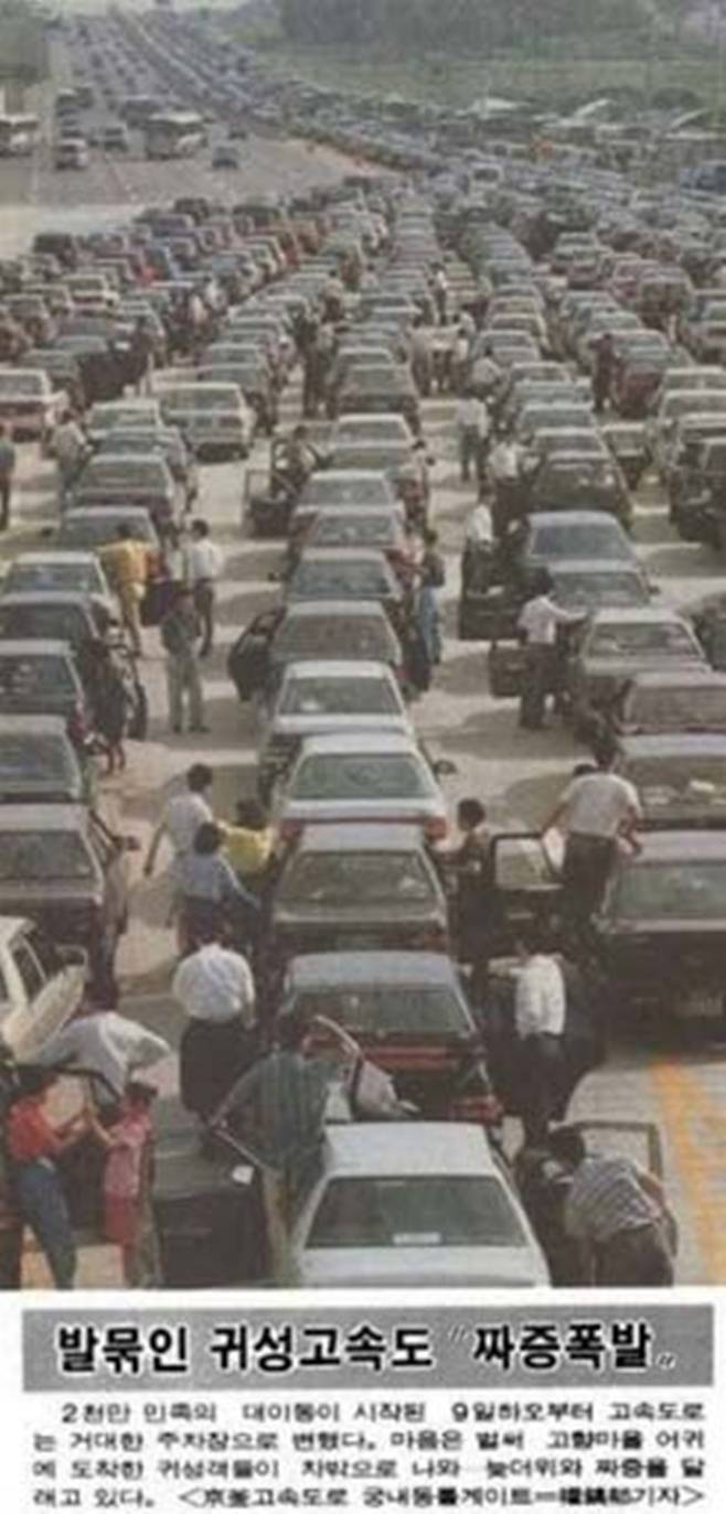 부모님 시대는 주 6일 출근과 더불어서 지금보다는 훨씬 많은 사람들이 명절에 고향에 내려갔다. 어렸을 때만 해도 명절에는 가족과 친척들이 함께하는 걸 당연하게 생각했다. 그래서 당시 명절 교통체증은 지금보다는 상상을 초월하는 정도였다.