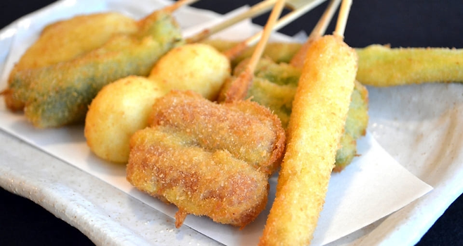 오사카의 대표적인 간식으로, 도시 곳곳에는 스탠드부터 오랜 전통을 자랑하는 식당까지 다양한 쿠시카츠 전문점이 있습니다.