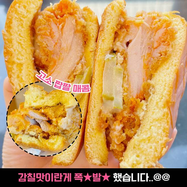 한 입 먹었는데.. 이럴수가! 진짜 넘나 맛있잖아요@@ 패티의 풍미가 장난없음 주의! 튀김옷은 바삭바삭하고 살짝 매콤한데, 치킨 속살은 정말 부드럽더라구요. 살짝 후추향의 시즈닝이 느껴지는 것 같기도.