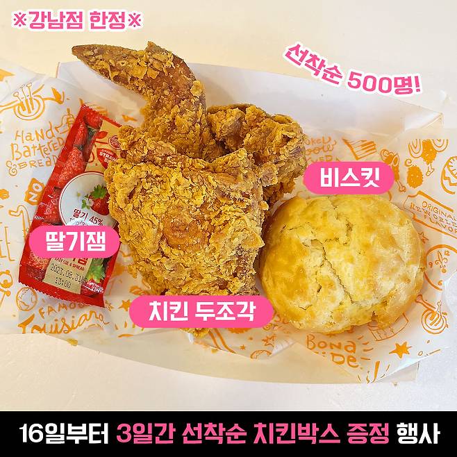 오픈 첫 날인 16일부터 선착순 500명에게 총 3일간 요 치킨 박스를 무료 증정하는 행사를 진행해요. 무료 증정이라고 해서 퀄리티 떨어지지 않아서 더 만족만족. 게다가 그리웠던 파파이스 치킨까지 두 조각 들어가 있으니 더 좋네요~