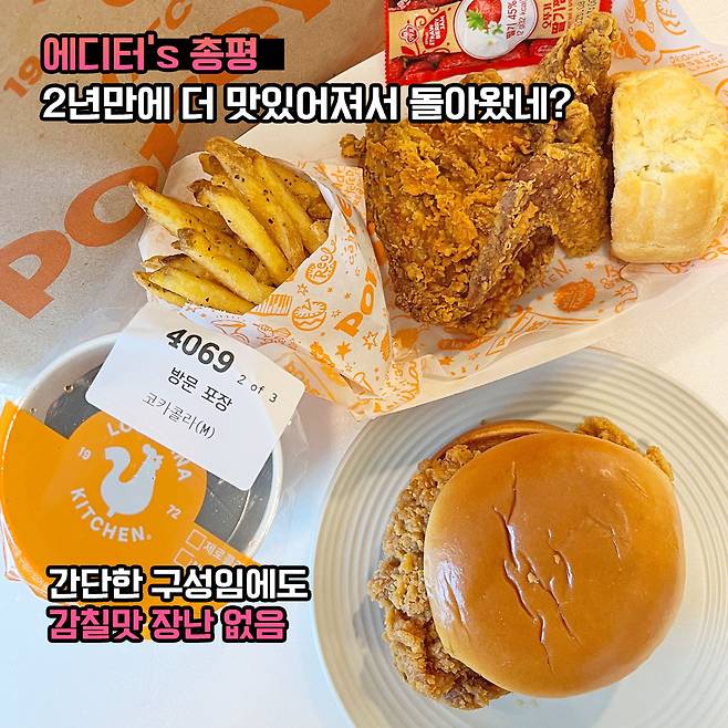 매장 이용은 더 대기를 해야 한다는 안내를 듣고, 후다닥 포장해온 밥심. 2년 만에 다시 마주한 파파이스 햄버거와 치킨이 정말 반갑네요♥️