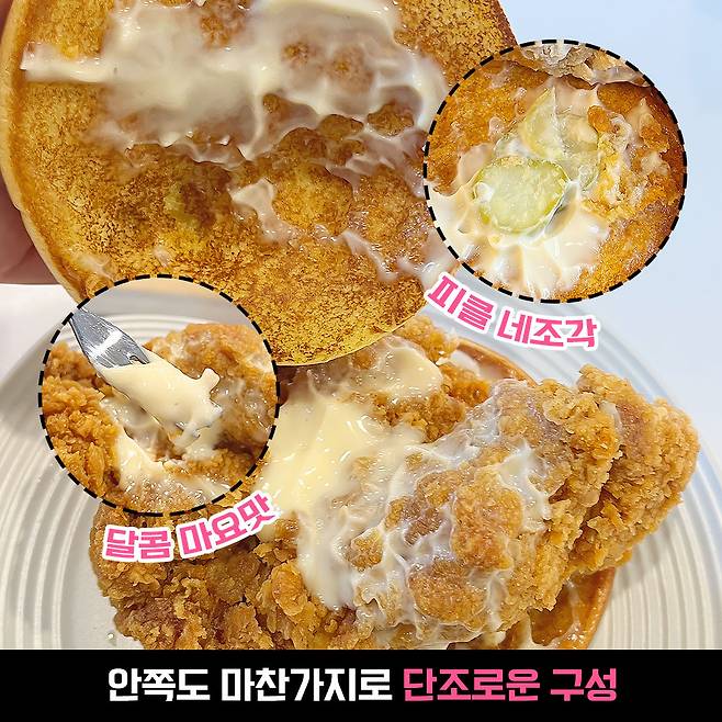 보셨다시피 버거는 번 사이에 피클과 소스 그리고 치킨 패티로 이루어져 있어요. 앞다퉈 풍성한 버거를 선보이는 요즘 햄버거와 다르게 정말 심플하죠?