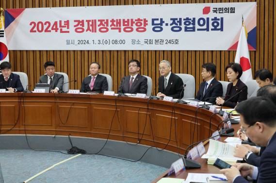 [유인촌 문화체육관광부 장관이 3일 오전 국회에서 열린 2024년 경제정책방향 당·정 협의회에서 인사말을 하고 있다. (사진=연합뉴스)]