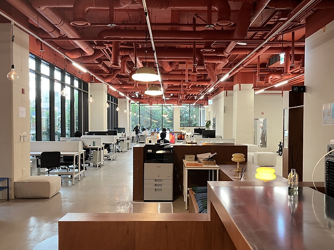 서교타운 건물 2층, 120평 규모를 자랑하는 코워킹스페이스는 로컬스티치에서 가장 매력적인 공간이자 이곳의 정체성이라고 해도 무방한 곳이다. 사방이 통창으로 둘러싸인 널찍한 공간에 개인 책상과 의자, 서랍장, 스탠드가 있어 업무에 집중하기 좋다. 이때, 고정석을 제외한 라운지 공간은 단기 숙박객도 사용할 수 있다. 덕분에 이곳에선 일과 휴가를 함께하는 워케이션이 가능하다.