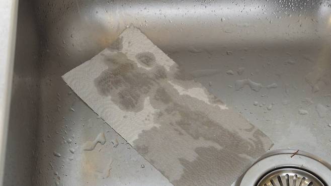 그럴 땐 얼룩이 있는 곳에 키친타월을 올려 두세요. 그리고 식초를 조금 뿌리세요. 이제 5분 정도 기다립니다. 이후 수세미로 닦은 후 물로 깨끗하게 헹궈 주면 끝이에요.