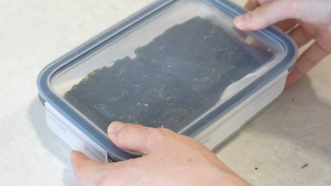 그럴 땐 밀폐용기에 먼저 키친타월을 깔아 주고 김을 넣으세요. 그리고 습기제거제를 함께 넣고 뚜껑을 닫아 줍니다. 그러면 습기 조절이 되어 더욱 오랫동안 김이 눅눅해지지 않는답니다. 그래서 더욱 맛있는 김을 오랫동안 즐길 수 있어요.