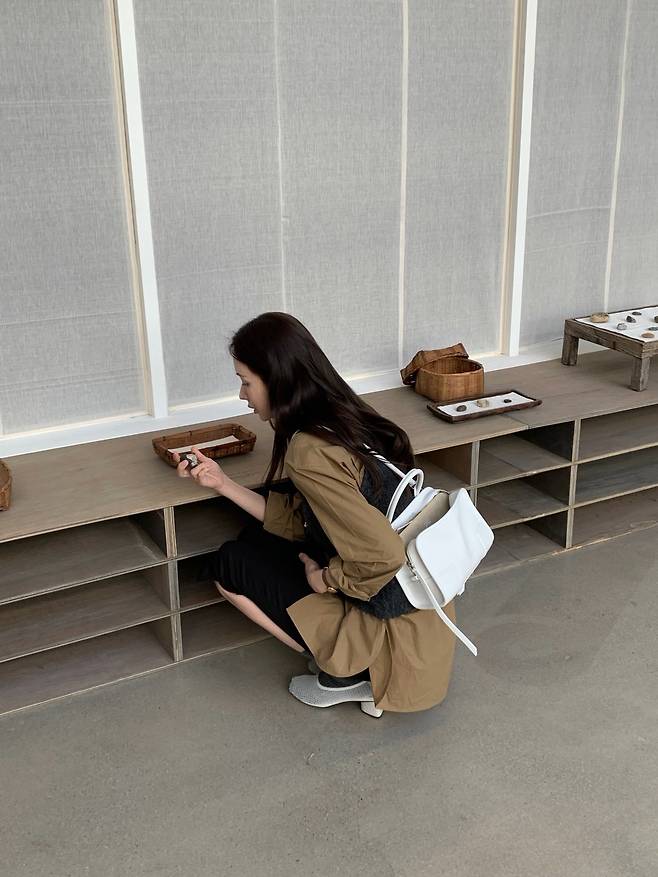 특히 벤치 위에 놓인 깨끗한 하얀색 가방은 어두운 톤의 의상 사이에서 선명한 대비를 이루며 전체적인 코디에 화사한 생동감을 불어넣는 영리한 포인트가 됩니다.