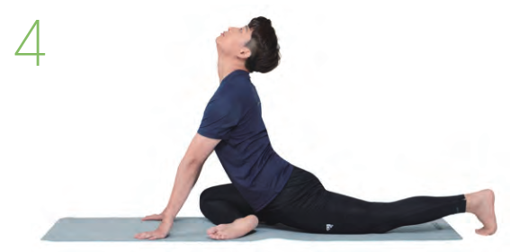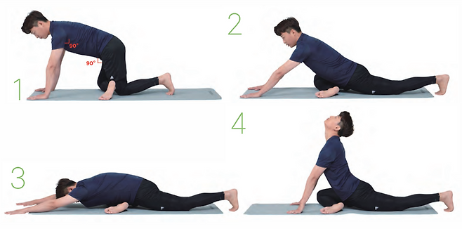고관절 뒤쪽 엉덩이에 당기는 느낌이 나면 운동을 정확하게 잘한 거예요. 만약 고관절 앞쪽에 관절이 집히는 느낌이 난다면 1번 과정에서 무릎을 더 많이 벌려서 고관절 앞쪽 공간을 크게 만든 뒤 운동을 진행하세요.