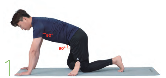 팔과 바닥이 수직이 되도록 손바닥을 바닥에 짚고 고관절을 90도 굽혀 무릎을 바닥에 대고 엎드립니다.