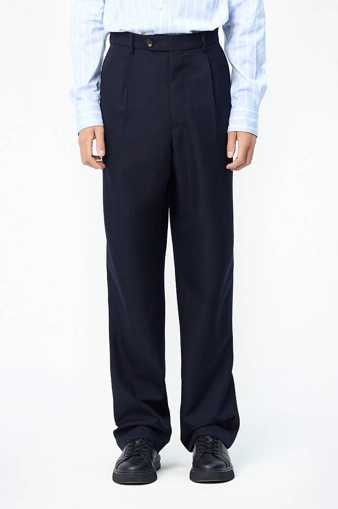 아름다운 네이비 색감과 턱 디테일의 팬츠 코튼 혼방 소재로