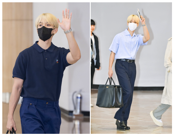 도겸 공항 출국길 패션 속 반팔 셔츠,