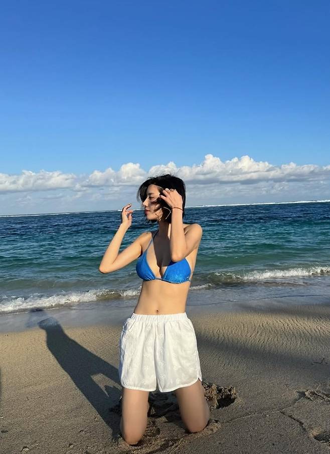 공개한 사진에서 권은비는 숏컷 헤어 스타일에 블루 컬러의 브래지어와 화이트 반바지, 또 핑크 크롭톱과 랩 스커트 셋업의 스윔웨어 비치룩으로 탄탄 S라인 몸매를 뽐냈다.
