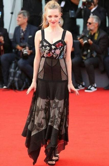 베니스 영화제 레드카펫에서는 시스루와 레이스 디테일이 돋보이는 블랙 드레스를 선택하여 화려하고 대담한 무드를 연출했습니다. 작품 속 절제된 모습과 레드카펫의 드라마틱한 스타일 사이의 대비는 아만다 사이프리드의 다채로운 매력을 보여줍니다. Alexander McQueen 2017 FW 컬렉션 드레스입니다.