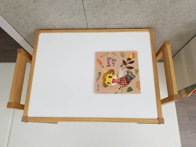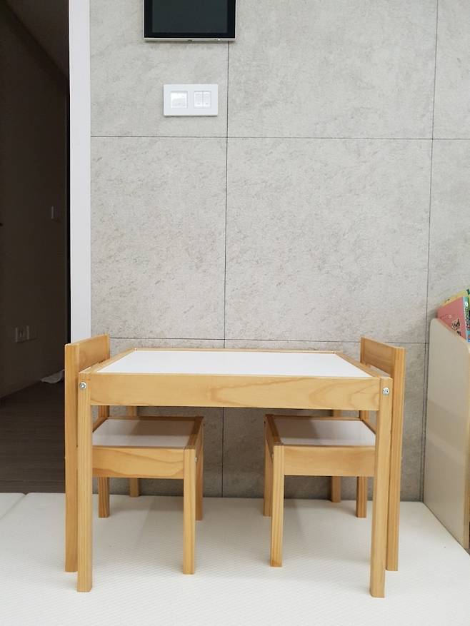 아직 가정 보육을 하다 보니 집에 있는 시간이 많은 아이, 그중에서도 주로 거실에서 많은 시간을 보내요. 아이와 함께 책도 읽고 그림도 그릴 수 있게 작은 책상 세트도 들였어요. 94cm 정도의 아이가 서서 놀기 좋은 책상이라 가끔 혼자 책상에 서서 자동차나 동물 피규어를 가지고 놀더라고요.
