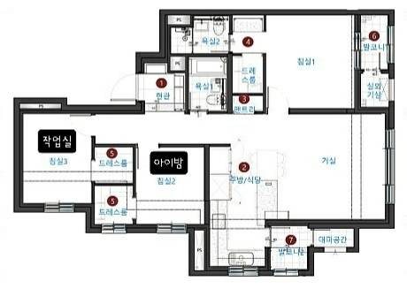 저희 집은 전용 면적 74㎡의 타워형으로 거실과 안방(침실 1)은 남향이에요. 이 타입을 선택한 이유 중 하나가 각 방마다 드레스룸이 있다는 거였어요. 미니멀을 추구하는 저한테는 수납장을 새로 사지 않고 기존에 있는 걸 활용할 수 있어서 너무 좋았어요.