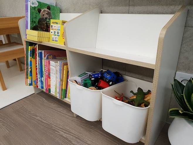 책장은 메이드바이뎃 제품인데 유아용 책장으로 딱 좋아요! 마찬가지로 심플한 디자인으로 골랐는데, 선반 부분이 약간 사선형으로 되어 있어 안정적으로 사용할 수 있어요. 장난감은 수납함을 이용해서 정리해 줬습니다.