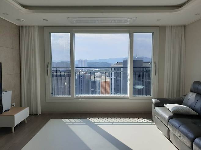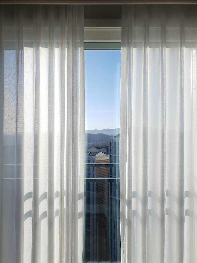 햇빛이 진짜 잘 드는 거실! 햇빛을 지키려고 거실에는 투명한 커튼을 달았어요. 분위기도 따뜻해지고 만족합니다.