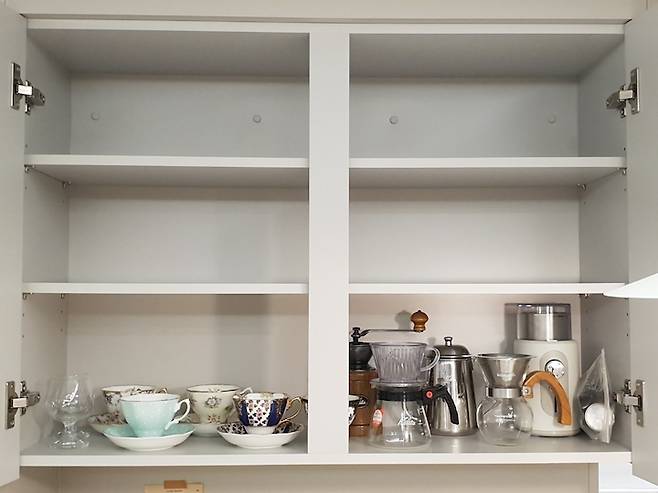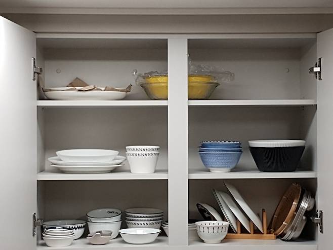 위에서 말씀드린 주방 상하부장의 수납공간이에요. 놀랍게도 그릇은 이곳에 있는 게 전부랍니다! 사실 그릇은 주부라면 누구나 유혹 당하는 분야죠. 여기서 미니멀한 생활을 위한 작은 습관 하나를 공유드려 보자면, 당장 마음에 드는 물건이라 하더라도 꼭 장바구니에 하루 이틀 정도 묵혀둔다는 점이에요.