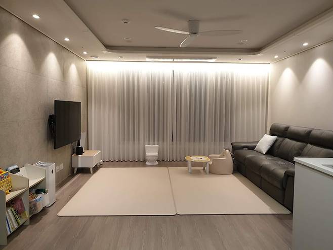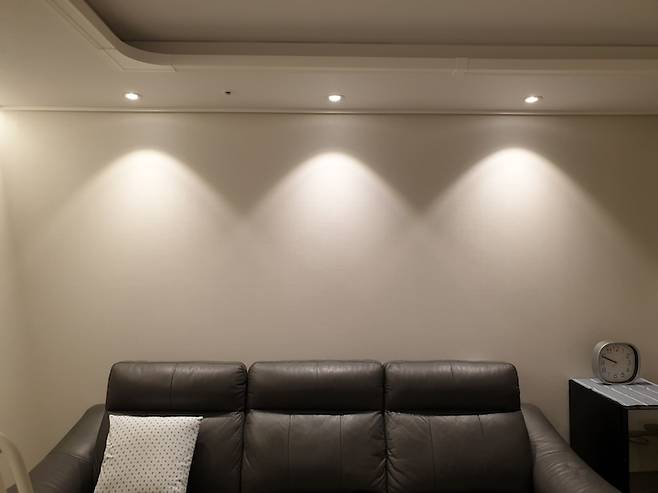 거실 소파 위로는 간접 조명을 달아주었는데, 주로 저녁 8시 이후에 많이 사용해요. 저녁밥을 먹고 아이가 목욕한 후로는 간접조명만 켜서 빨리 잠들기 좋도록 은은한 분위기로 바꿔놓아요. 분위기도 좋고 마음도 차분해져서 잠이 더 잘 오는 것 같아요.