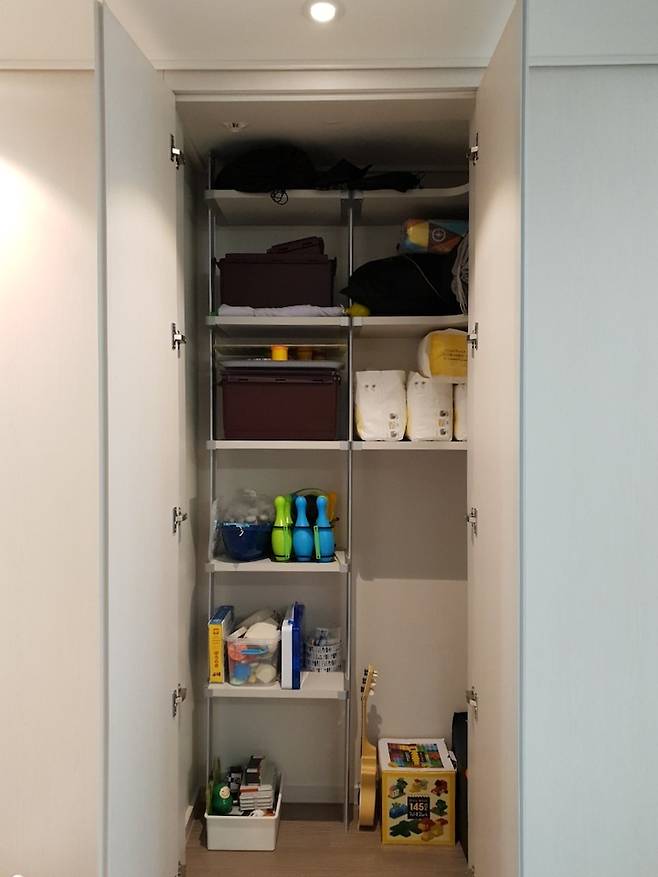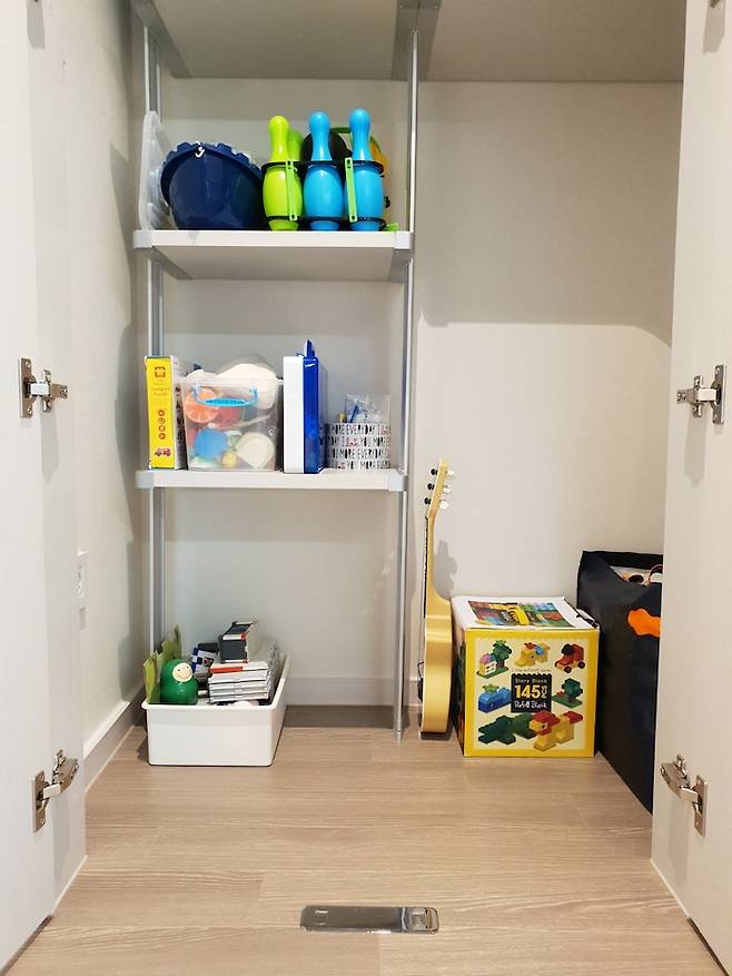 거실 한 옆에는 팬트리가 하나 있는데요. 거실과 가까운 곳이라 아래쪽엔 아이의 장난감을 수납했어요. 혼자서 문 열고 장난감을 꺼내서 놀거나 안에서 놀거나 하더라고요. 그 모습이 귀엽기도 하고, 작은 비밀 아지트 같기도 해서 너무나 좋아하는 공간입니다. :)