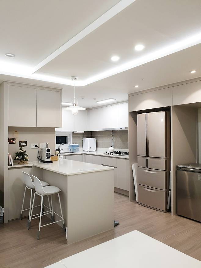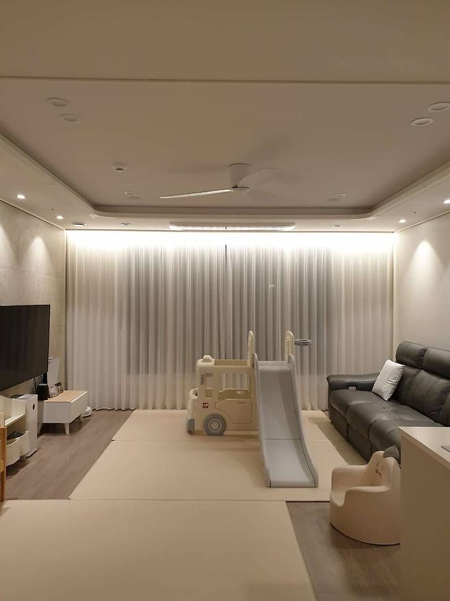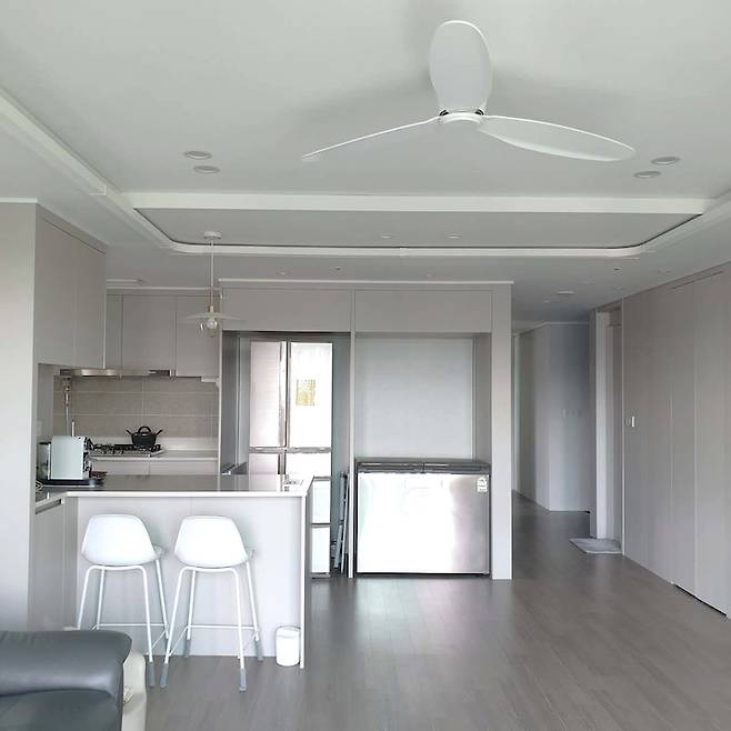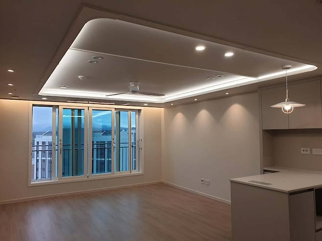 신축 아파트라 사실 추가로 시공할 생각이 전혀 없었는데, 다른 분들이 간접 조명과 실링팬을 시공한 사진을 보니 너무 예뻐서 저희도 설치하기로 했어요. 고층이라 창문을 열어 놓고 실링팬을 돌리면 여름에 그렇게 덥지 않을 것 같아 전기세도 절약되지 않을까 하는 생각이 들었습니다.