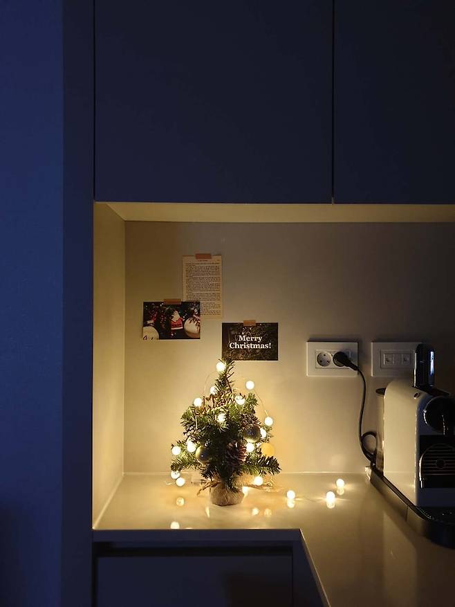 곧 크리스마스라 미니 트리를 놓고 분위기를 냈어요. 작지만 존재감 뿜뿜이라 아이도 너무 좋아합니다. 큰 트리는 조금 부담스러워서 고민했었는데 작은 걸 사길 잘 한 것 같아요.