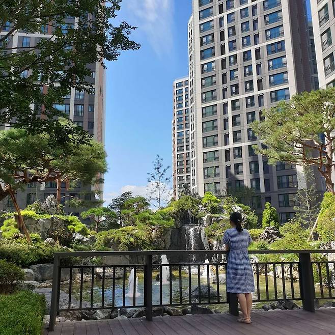 신축 아파트라 그런지 단지 내에 아이들 놀이터와 휴식 공간이 참 예쁘게 되어 있더라고요. 이곳은 아이와 낮에 자주 찾는 곳이에요. 물 멍하기 딱 좋은 곳입니다.
