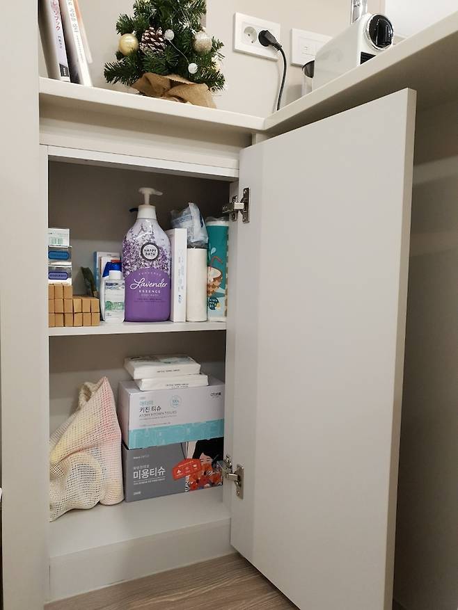 하부장에는 생필품이 들어 있어요. 소모품이라 많이 쟁여둬도 좋지만, 그때그때 필요한 만큼만 사두는 편입니다. 많은 분들이 수납공간이 부족해서 걱정하시지만, 저희의 경우는 오히려 매우 널널하게 사용하고 있어요. 물건의 가짓수를 줄이면 수납의 걱정이 없어서 좋아요.