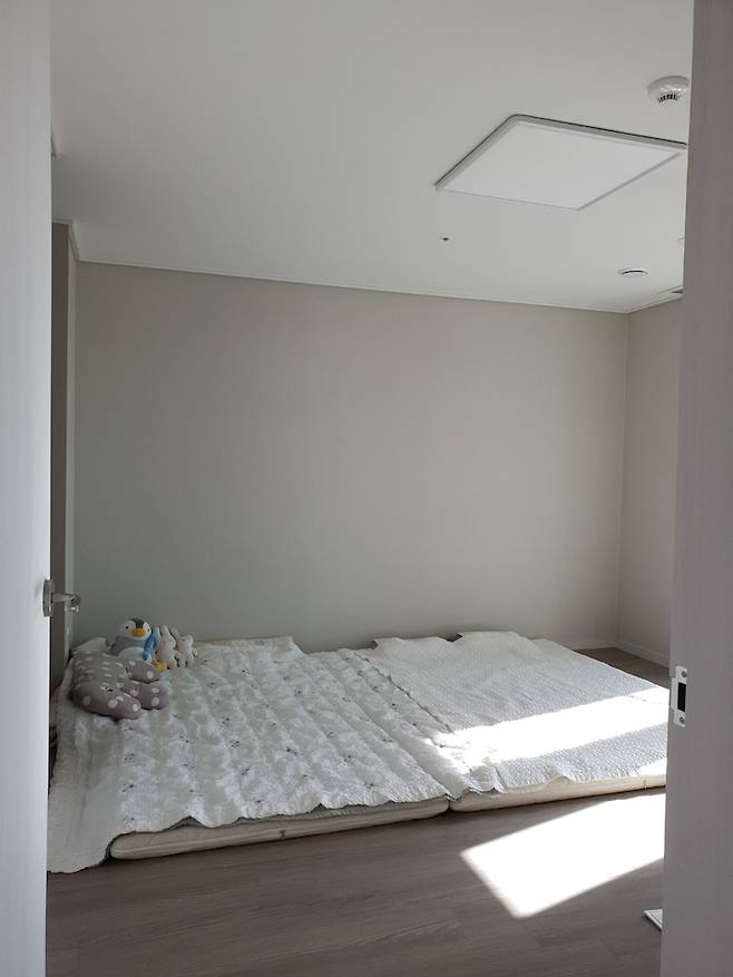 거실 옆에 위치한 안방의 모습이에요. 주로 아이와 함께 잠을 자는 곳이기에 마찬가지로 최대한 물건을 놓지 않았습니다. 사진에 보이는 것처럼 토퍼와 침구, 조명과 매트뿐이에요. 아직 어린 아기가 있어서 침대는 들이지 않고 토퍼 두 장만 깔아뒀는데 아이가 잘 때 마음대로 굴러다녀도 위험하지 않아서 좋아요!