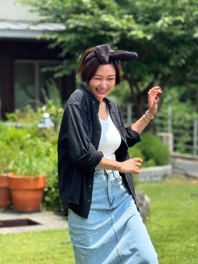 데님 스커트는 90년대의 복고 감성을 오늘날에 맞게 세련되게 다듬은 아이템이다. 변정수가 착용한 밝은 워싱의 청량감 있는 블루 컬러는 한층 젊고 발랄한 이미지를 연출하며, 허리선을 강조하는 디자인은 몸매를 자연스럽게 살려준다. 여기에 그녀는 큰 리본 모양의 헤어밴드를 착용해 경쾌한 포인트를 더했다.