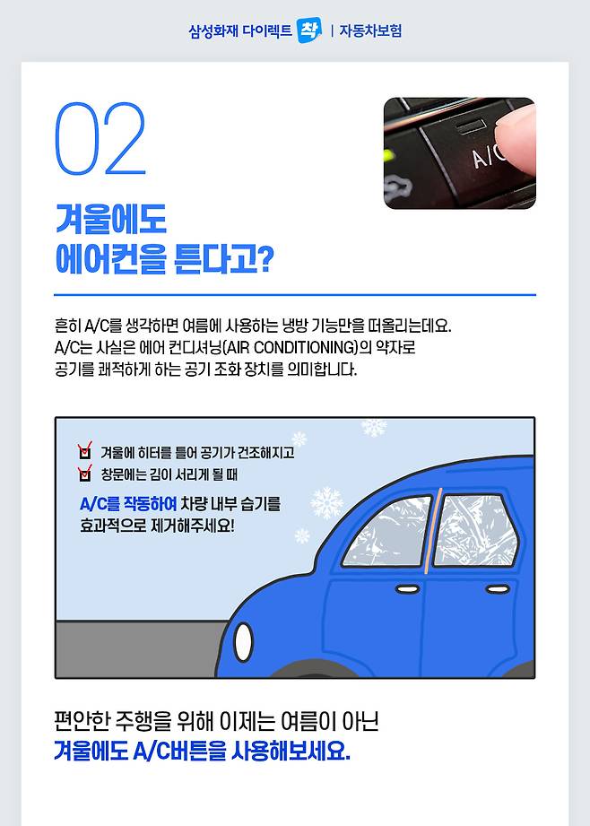 그래서 겨울에 히터를 틀어 공기가 건조해지고 차량 내부와 외부의 온도 차이로 창문에 김이 서리게 될 때, A/C를 작동해보세요. 이내 공기가 쾌적해지고 차량 내부 습기를 좀 더 효과적으로 제거할 수 있어 편안한 주행을 할 수 있습니다. 에어컨이 기본적으로 제습기능을 포함하고 있듯, 차량 A/C 버튼도 습기가 생길 경우 유용하게 활용할 수 있습니다. 이제는 여름이 아닌 겨울에도 A/C버튼을 사용해보세요.