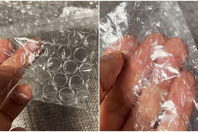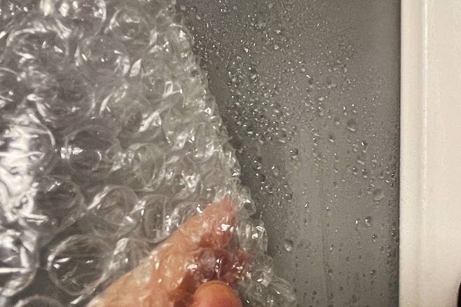 뽁뽁이를 자세히 보시면 한쪽은 볼록하고 한쪽은 평평한 면이 보이실 거예요. 평평한 면으로 붙이실 경우 흘러내리기 쉬우니 볼록한 부분을 붙이셔야 해요