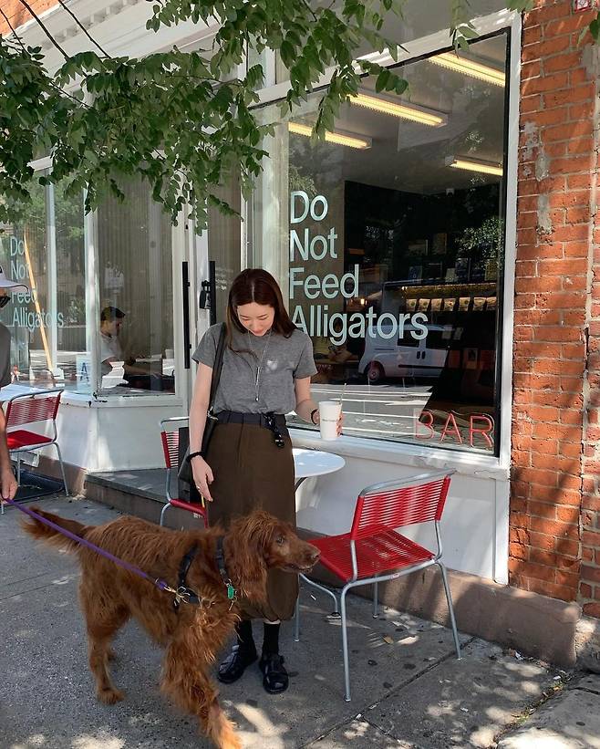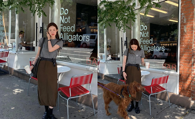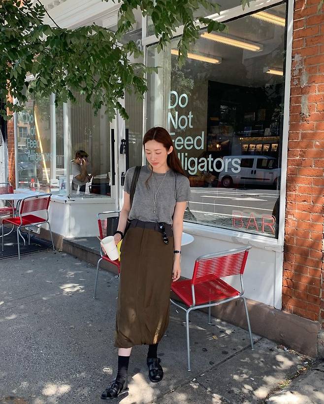 사진 속 차정원은 그레이 반팔티와 브라운 롱 스커트를 입고 블랙 롱삭스와 로퍼를 신어 꾸안꾸 데일리룩을 선보였다.