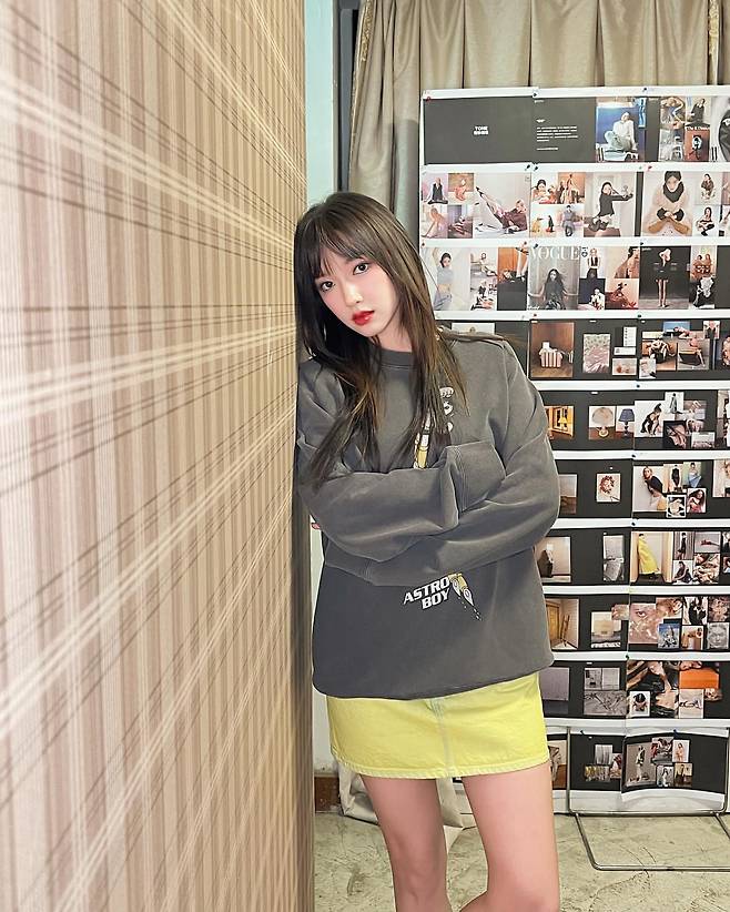 성소는 그레이 스웨트셔츠와 네온 옐로우 미니스커트를 매치한 과감한 스트릿 패션을 선보이고 있다. 'ASTRO BOY' 로고가 프린트된 그레이 스웨트셔츠는 레트로한 감성을 더하고, 비비드한 네온 옐로우 미니스커트와의 대비로 시선을 사로잡는 스타일링을 완성하고 있다. 벽에 기대어 선 포즈로 쿨한 분위기를 연출하며, 배경의 패션 무드보드와 함께 트렌디한 감각을 보여주고 있다.