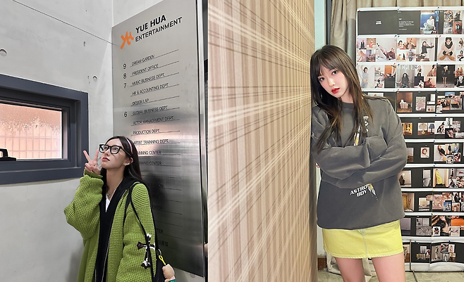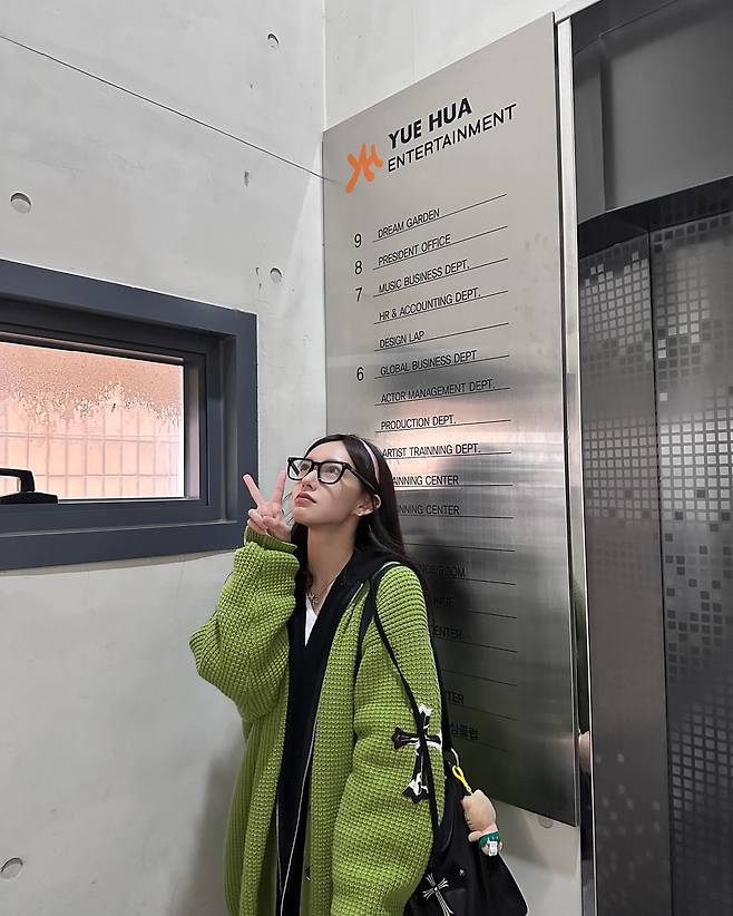 성소는 유화 엔터테인먼트 사옥에서 라임 그린 컬러의 니트 가디건과 블랙 레이어드, 캐주얼한 액세서리를 매치한 스타일을 선보이고 있다. 특히 눈에 띄는 라임 그린 컬러의 니트 가디건은 봄철 트렌드 컬러를 반영하면서도 오피스 룩에 생기를 불어넣고 있다. 블랙 프레임 안경과 함께 지적인 이미지를 더하며, V 포즈로 경쾌한 분위기를 연출하고 있다.