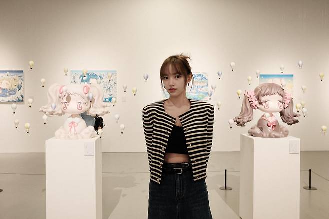 성소는 미술 갤러리에서 스트라이프 패턴의 카디건과 블랙 크롭탑, 하이웨이스트 데님 팬츠를 조합한 세련된 캐주얼룩을 선보이고 있다. 흑백 스트라이프 카디건은 클래식한 느낌을 주면서도 현대적인 감각을 더하고 있으며, 블랙 크롭탑과의 레이어드 스타일링으로 세련된 분위기를 연출하고 있다. 갤러리 내부의 아트 피스들과 어우러져 문화적 감성이 돋보이는 패션 센스를 보여주고 있다.