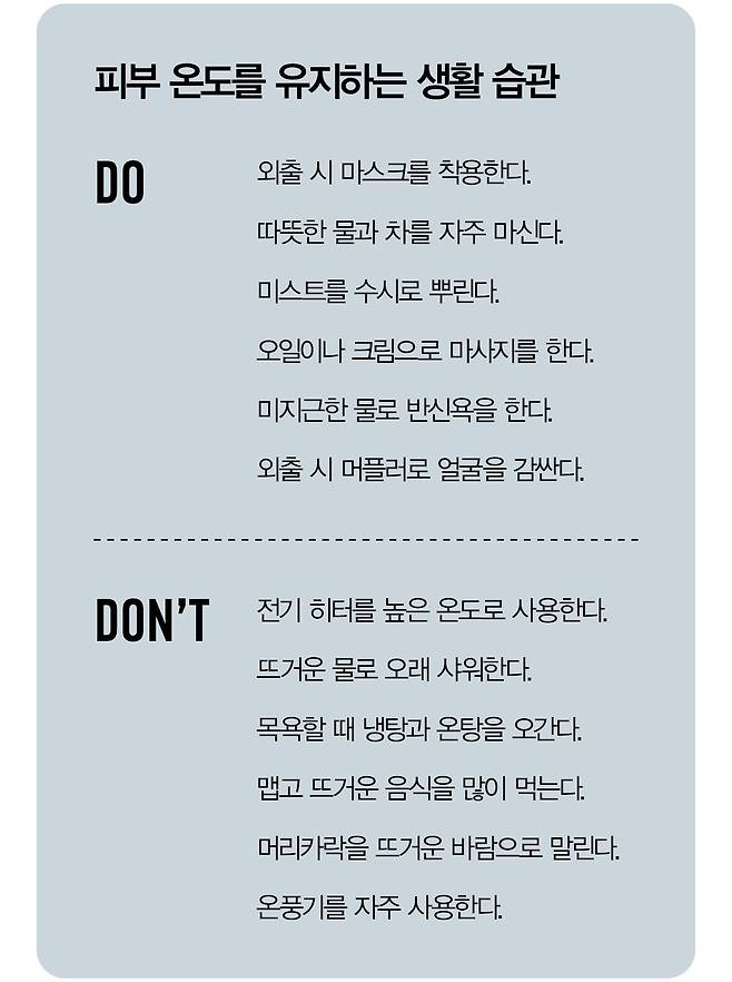 겨울철 차가워진 피부를 무조건 뜨겁게 바꾸는 것이 능사는 아니다. 이상적인 피부 온도인 31~32℃를 유지하는 것이 관건. 피부 온도를 너무 높거나 낮게 하는 행동을 지양하자. 외출 시 머플러나 마스크를 착용하고, 얼굴과 몸을 데우는 효과가 있는 반신욕을 주 2~3회 정도 하길 권장한다. 전신이 순환하면서 신진대사가 촉진되어 얼굴과 몸의 냉기가 사라지는 효과가 있다. 단, 너무 뜨거운 물로 목욕하는 건 금물. 따스함을 느끼는 정도로, 체온보다 약간 높은 38~40℃의 물에서 20분 이하로 입욕하자. 또 아이스커피 대신 미지근한 물이나 따뜻한 차를 마시는 것이 좋다. 수분이 부족하면 신체의 온도가 떨어지기 때문에 이뇨 현상을 촉진하는 카페인 음료 섭취는 자제하고, 물을 수시로 충분히 마실 것. 화장품을 사용할 때도 피부 자극을 줄이고 냉노화를 방지하는 아이템을 선택해, 마사지까지 병행해 사용하자.