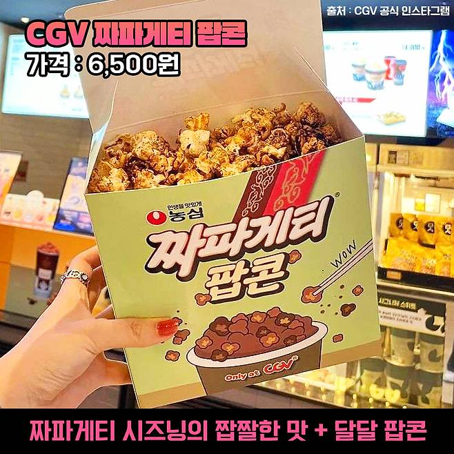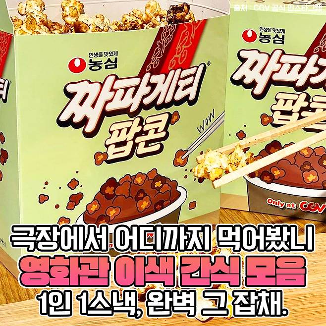 CGV는 정말 많은 신상 간식을 내놓는 것 같아요. 짜파게티 팝콘은 농심과 공동 개발한 팝콘인데요. 비주얼부터 짜장짜장한 게 과연 어떤 맛일지 궁금하더라구요.