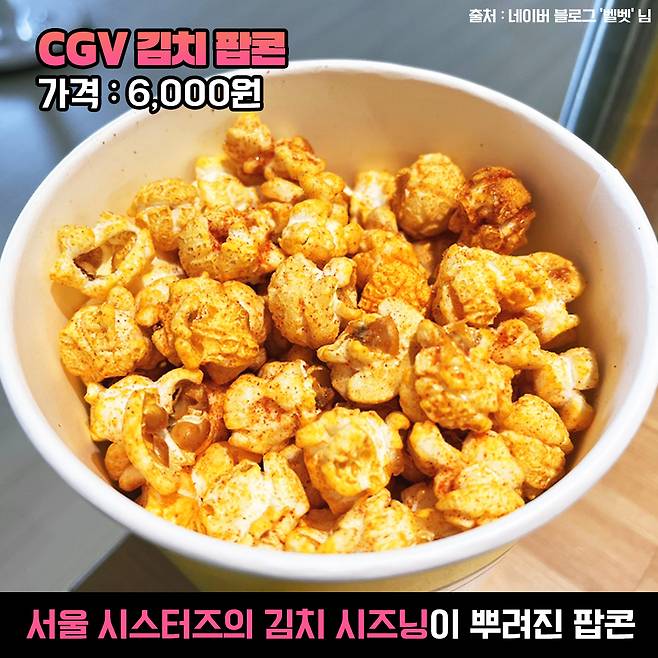 김치로 유명한 서울시스터즈와 CGV가 협업한 김치 팝콘! 작년에 콜라보 상품으로 잠깐 나왔다가 이제는 완제품으로 계속 만나볼 수 있어요. 지점마다 다르니 미리 문의해보는 걸 추천드려요.