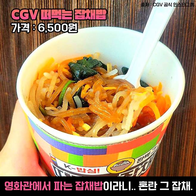 영화관에서 잡채밥이라니? 출시 소식과 동시에 많은 논란을 일으켰던 CGV 떠먹는 잡채밥이에요. 아직 영화관에서 먹는 잡채밥이라는 게 낯설기는 하지만 극장 로비에서 급하게 끼니를 때워야 할 때 혹은 밥을 못 먹고 영화를 봐야 할 때 넘 유용할 것 같은데요?