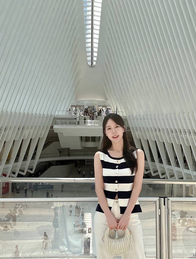 뉴욕 월드트레이드센터 오큘러스의 하얀 리브 구조 아래, 이지현 아나운서가 클래식 스트라이프 니트 톱으로 여름의 한 페이지를 장식했다. 대칭적인 건축미와 어우러진 그녀의 모습은 마치 패션 화보의 한 장면처럼 시선을 사로잡았다.
