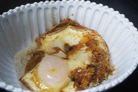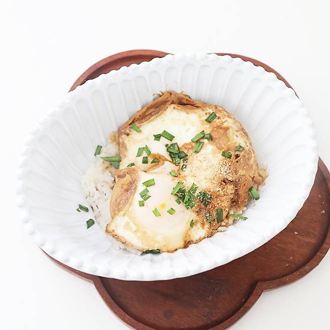 밥을 접시에 담고 전자레인지에서 익힌 계란과 간장소스를 부어요.