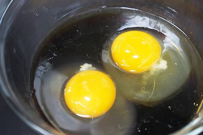 계란 2개를 깨뜨려 넣고, 노른자를 포크나 젓가락으로 찔러주세요.