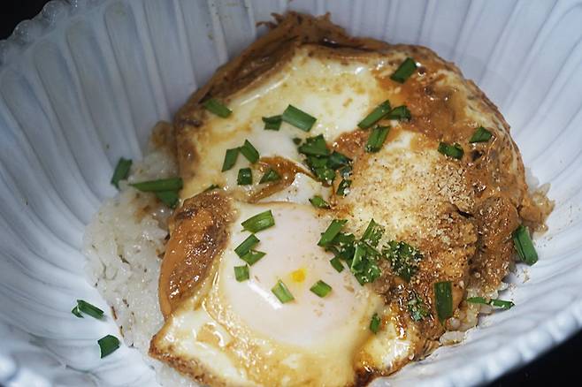 밥을 접시에 담고 전자레인지에서 익힌 계란과 간장소스를 부어요.