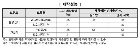 일체형 제품끼리 비교했을 시에는 평가 목록에 따라 우수 제품이 달랐다. 세탁 성능을 비교했을 때 LG제품의 반사율이 삼성보다 3% 포인트 높았다.