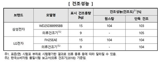 건조성능은 삼성과 LG 일체형 모두 원스톱 코스와 단독 건조 시 건조도가 103% 이상으로 기존 건조기와 성능 차이가 없었다. 다만 일체형 세탁건조기의 최대 건조 용량은 15㎏으로, 기존 건조기(20㎏ 이상)보다 적다. 가격은 삼성전자의 경우 온라인 몰 기준가 409만원, LG전자는 쿠폰 적용가 421만원이다.