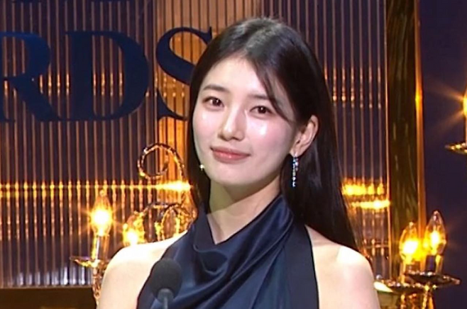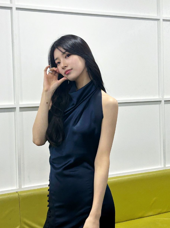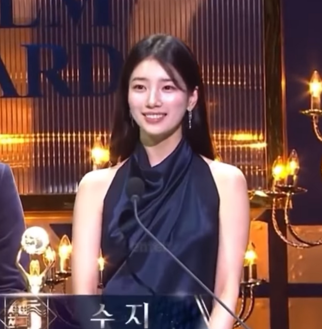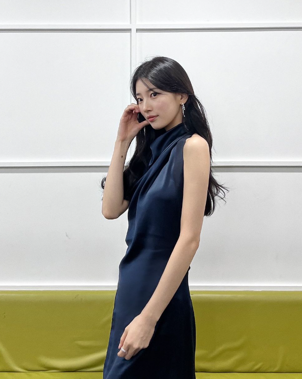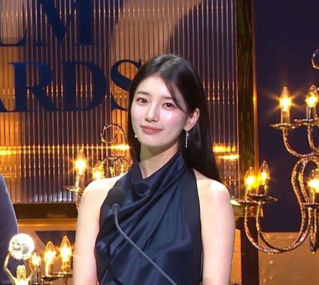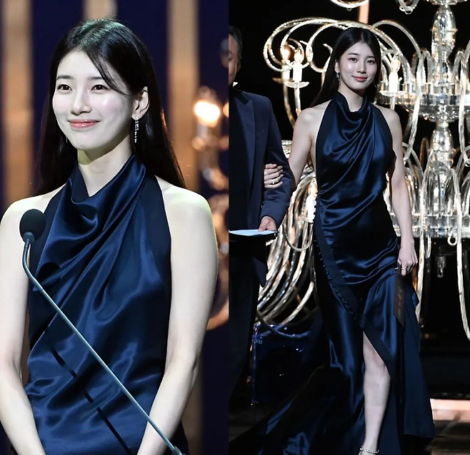청룡영화제에서 수지는 네이비 컬러 실크 드레스를 입고 우아한 자태를 뽐냈다.