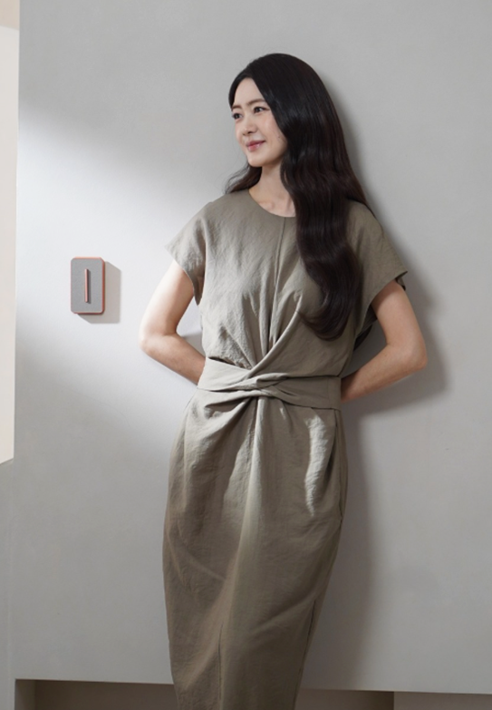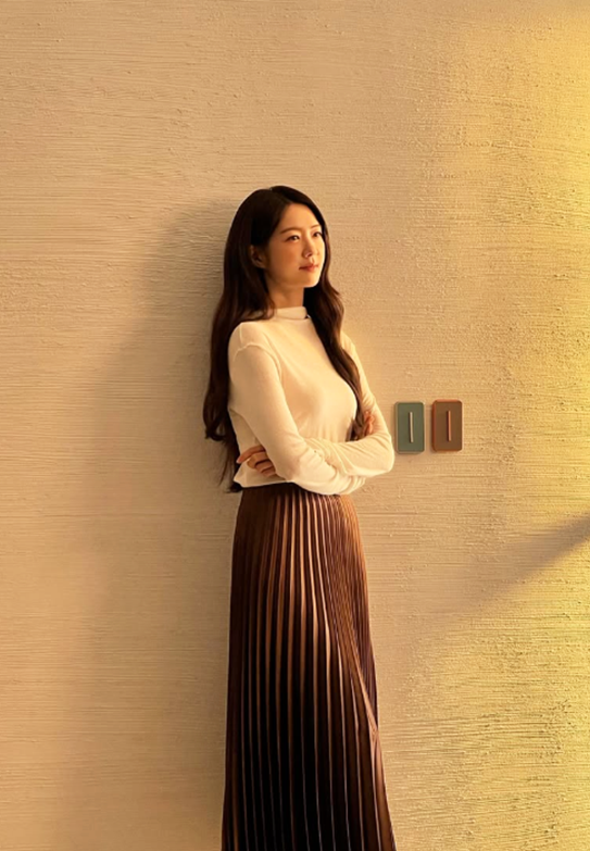 이요원은 화이트 톤의 슬림한 니트 상의에 브라운 계열의 롱 플리츠 스커트를 매치해 부드러운 색감의 조화를 완성했다.