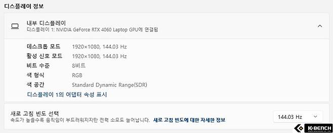 144Hz 고주사율 지원 역시 이정도면 충분하다고 생각되며, 그 이상은 웬만한 고성능 노트북이더라도 요즘 최신게임에서 프레임을 그 이상으로 유지하는 건 쉽지 않다. 따라서 144Hz면 부족함 없는 고주사율이고, 충분히 부드러운 화면을 제공받을 수 있다.