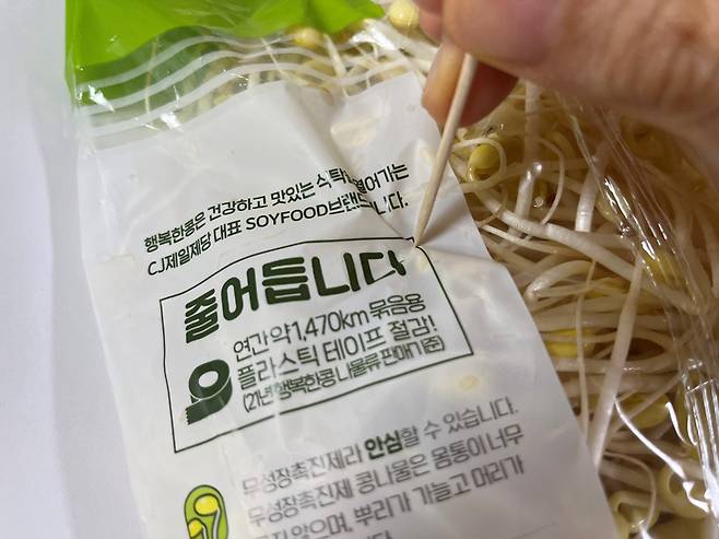 그렇기 때문에 봉지째 그냥 두지 마시고 이쑤시개로 작은 구멍을 뚫어서 보관해 보세요. 이렇게 하면 콩나물을 보관하는 데 일시적으로 도움이 될 수 있습니다.